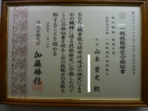 1級眼鏡作製技能士の技術で安心で掛け心地の良いメガネをお作りいたします。
